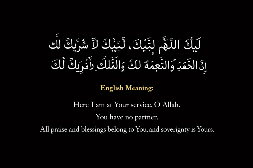 Here I am at Your service, O Allah. You have no partner. All praise and blessings belong to You, and sovereignty is Yours.